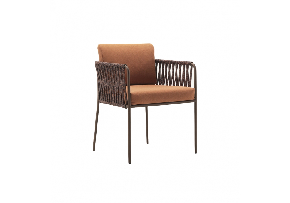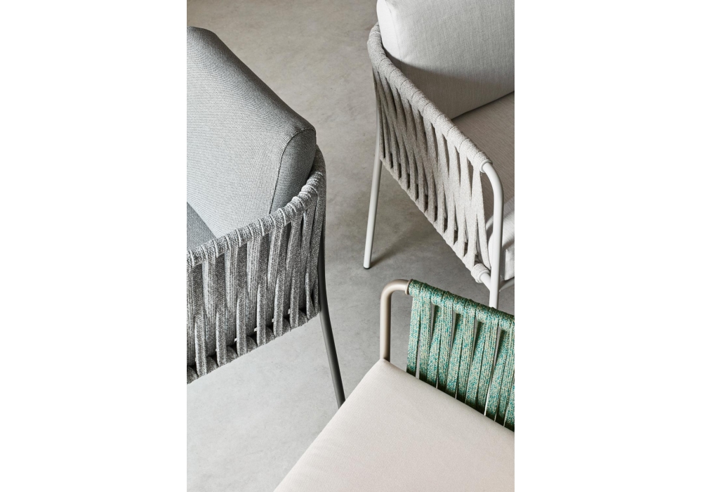 Nido diseñado por Javier Pastor para Expormim es un sillón bajo con estructura de tubo de acero inoxidable y asiento y respaldo tejidos a mano con cuerda hecha de poliéster de alta resistencia. Disponible en diferentes acabados.