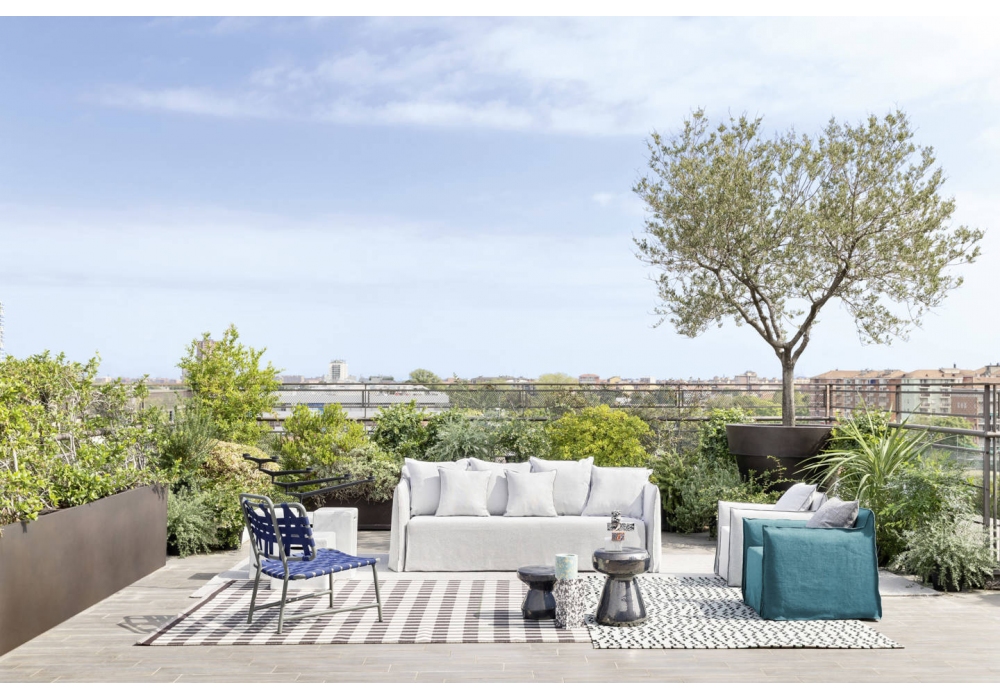 Ghost Out 05 diseñada por Paola Navone para Gervasoni es una butaca de exterior acolchada realizada con tapizado desenfundable en tela.