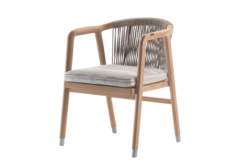Crono Outdoor diseñado por Antonio Citterio para Flexform es un sillón de exterior con estructura en madera maciza de Iroko, carcasa con cuerda de pvc o polipropileno tejida a mano y funda de cojín en tejido outdoor.