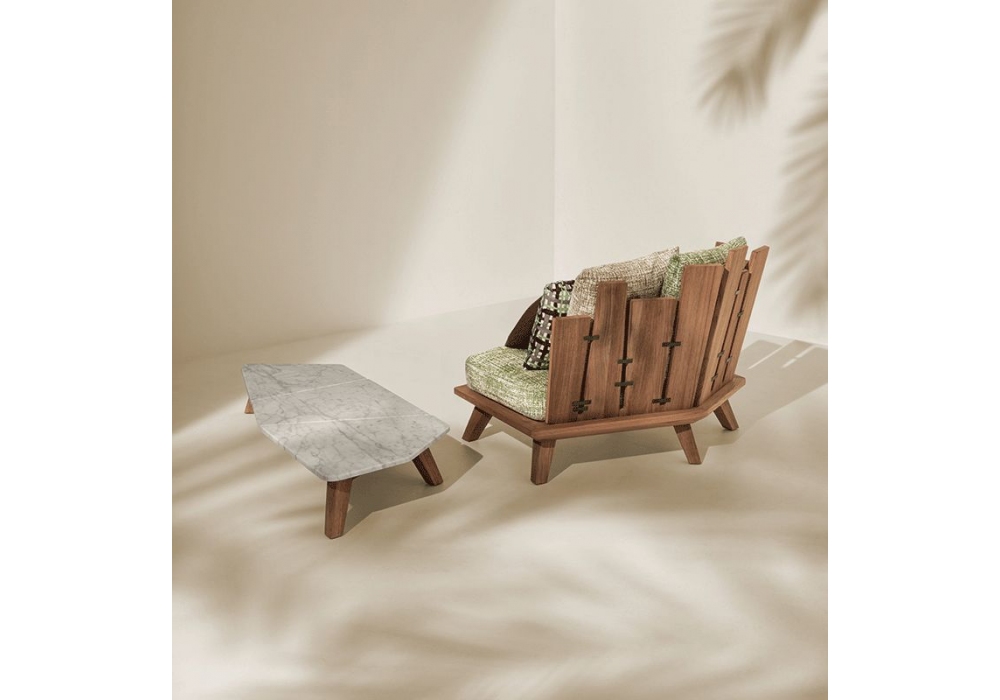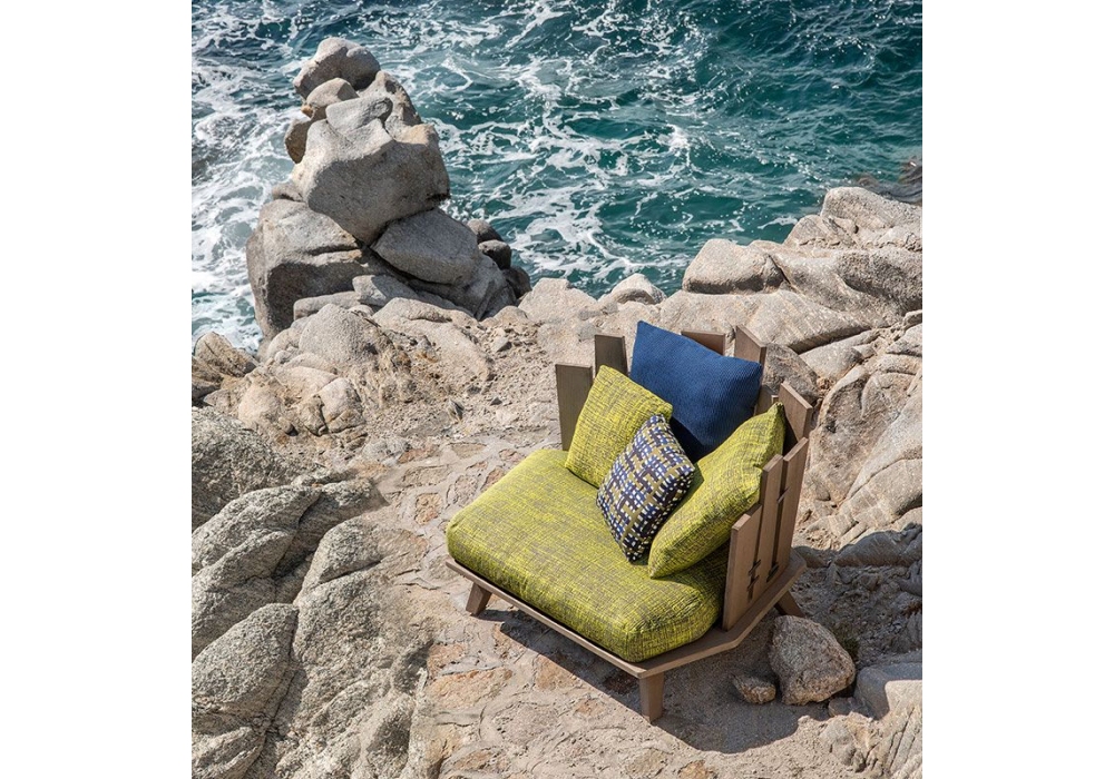 Rafael diseñado por Paola Navone para Ethimo es un sillón con cuerpo en madera de teca y cojines en tela. Rafael está disponible en diferentes acabados.