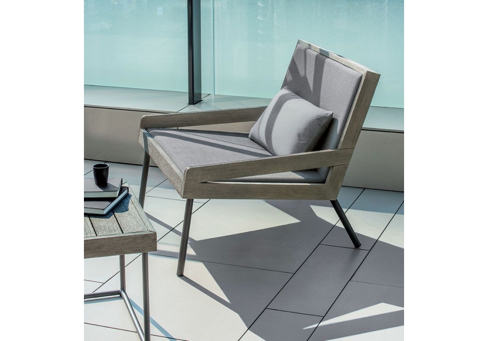Allaperto Urban diseñado por Matteo Thun, Antonio Rodriguez para Ethimo es un sillón estructurado en madera de teca decapada y metal con revestimiento en tela cappuccino batyline.