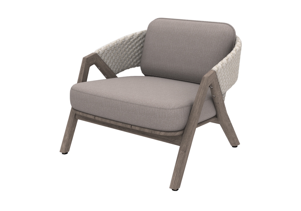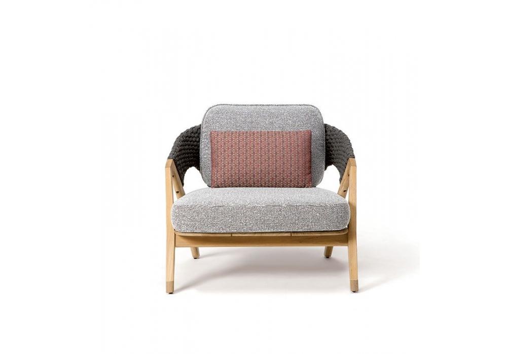 Knit diseñado por Patrick Norguet para Ethimo es un sillón estructurado en madera de teca en acabado natural o decapado revestido con una trama de cuerda. Los cojines del asiento y del respaldo son de tejido de polipropileno. Knit está disponible en diferentes acabados y revestimientos.