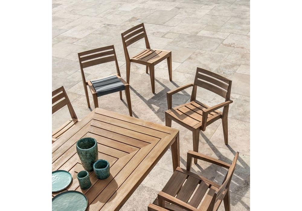 Ribot diseñada por Marc Sadler para Ethimo es una butaca con estructura portante en madera de teca natural. Los cojines de los asientos están tapizados en material acrílico hidrófugo y no están disponibles en diferentes acabados.