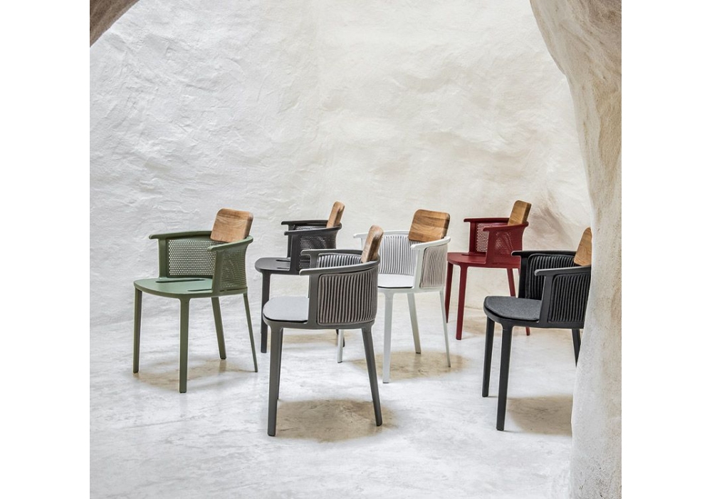 Nicolette diseñada por Patrick Norguet para Ethimo es una butaca con estructura portante en aluminio pintado y madera de teca natural. Los cojines están revestidos de material acrílico hidrófugo disponible en diferentes acabados.