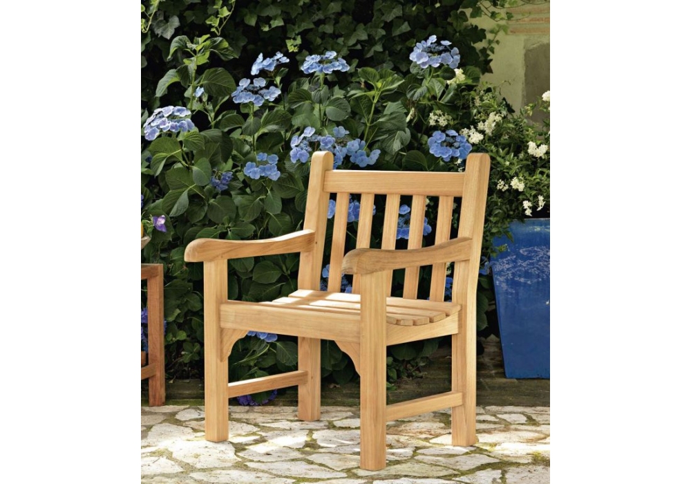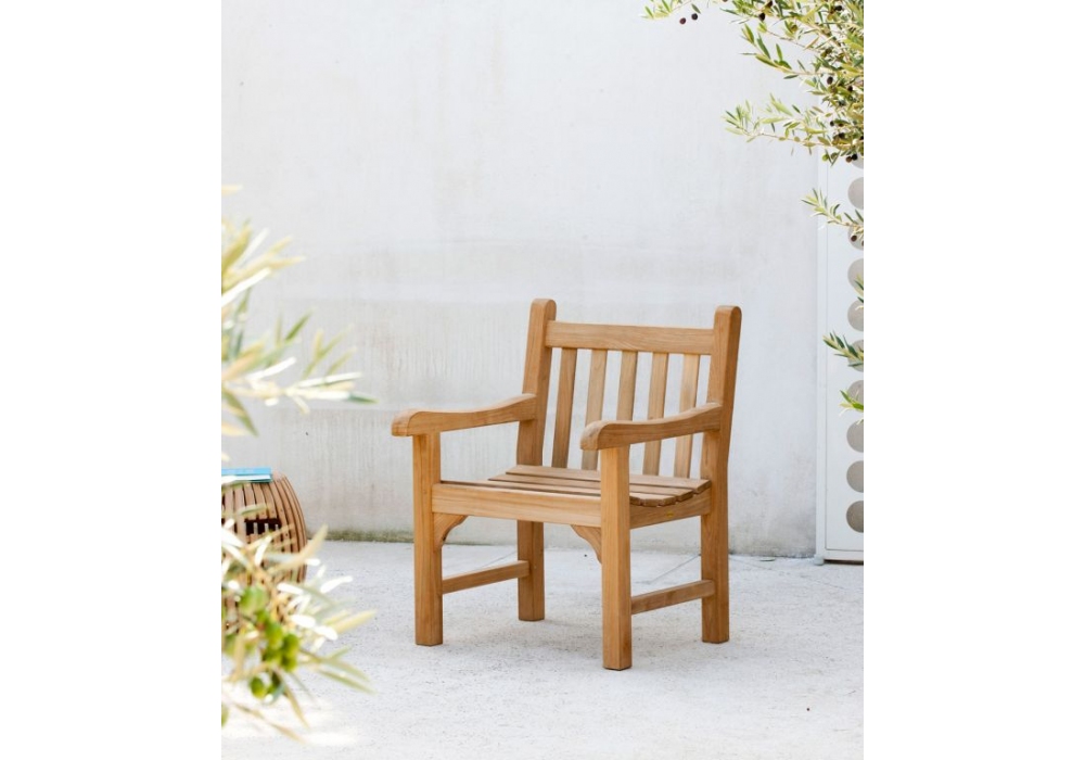Chelsea diseñada y producida por Unopiù es una butaca con estructura de madera de teca natural. Los cojines de los asientos están hechos de tela acrílica color leche.