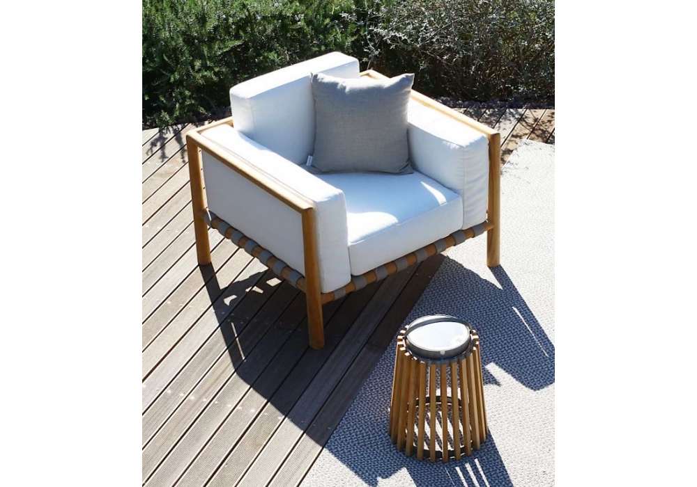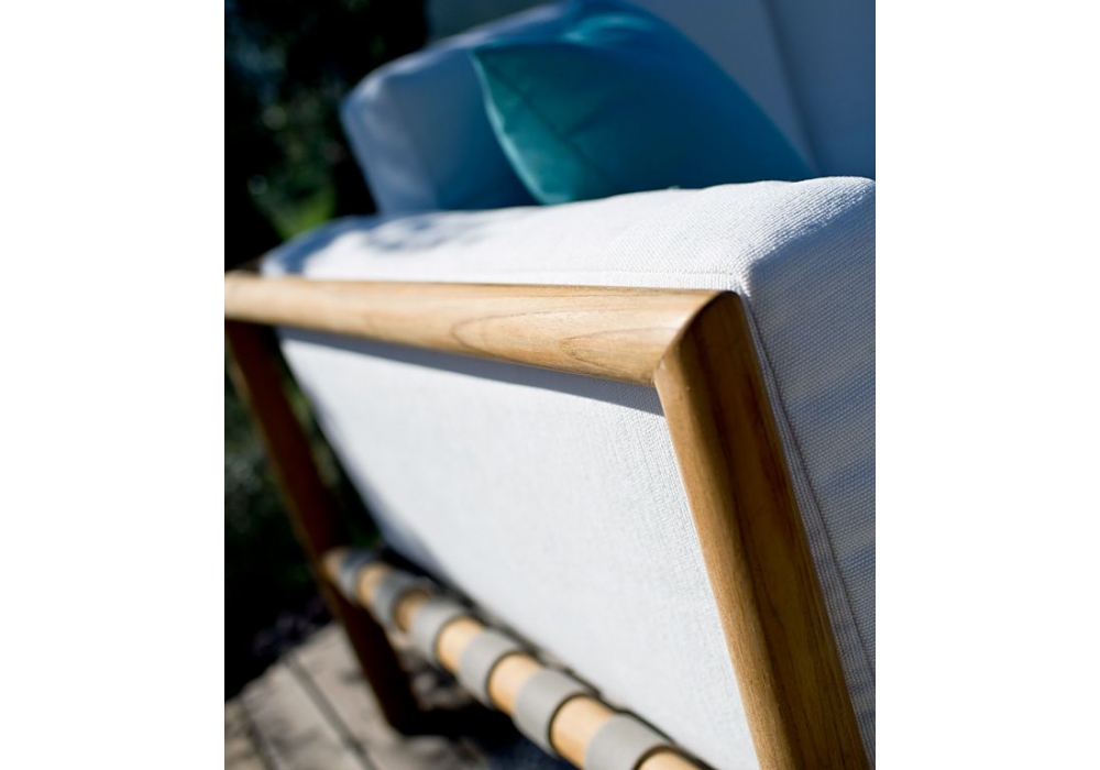 Pevero diseñado y producido por Unopiù es un sillón con estructura de madera de teca. Los cojines del asiento y del respaldo están confeccionados en tejido acrílico en diferentes acabados.