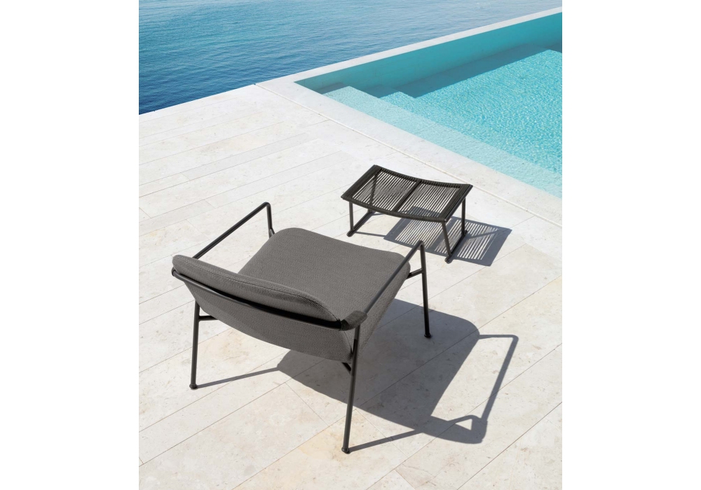 Coral diseñado por Marco Acerbis para Talenti es un sillón de exterior con estructura de aluminio y asa de cuerda del asiento. Los cojines tienen fundas removibles y están tapizados en telas para exteriores resistentes a la intemperie.