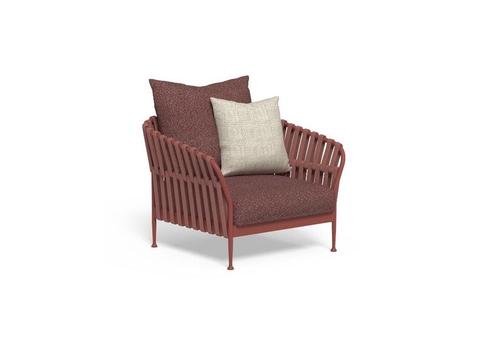 Frame diseñado por Ludovica + Roberto Palomba para Talenti es un sillón para uso en exteriores. Estructura en aluminio pintado en polvo. Estructura del respaldo rivestida con cuerda acolchada. Los cojines tienen fundas removibles y están tapizados en telas para exteriores resistentes a la intemperie.