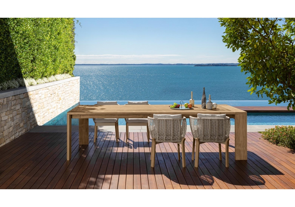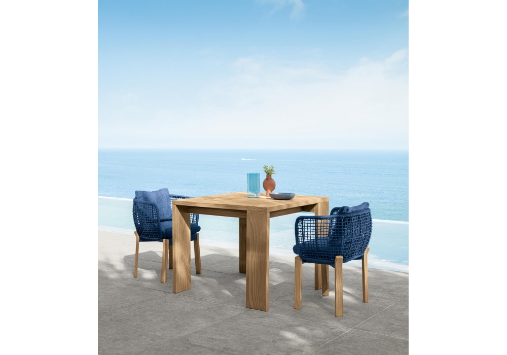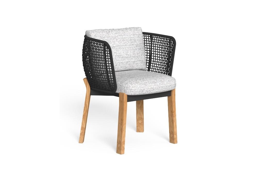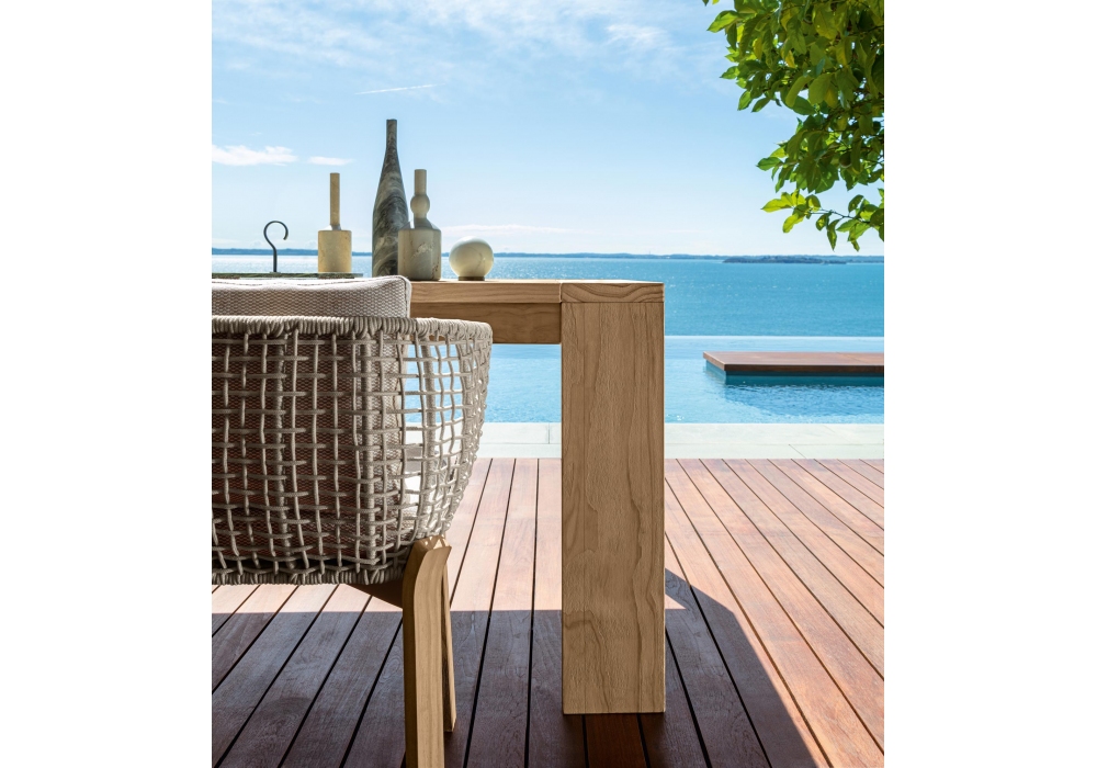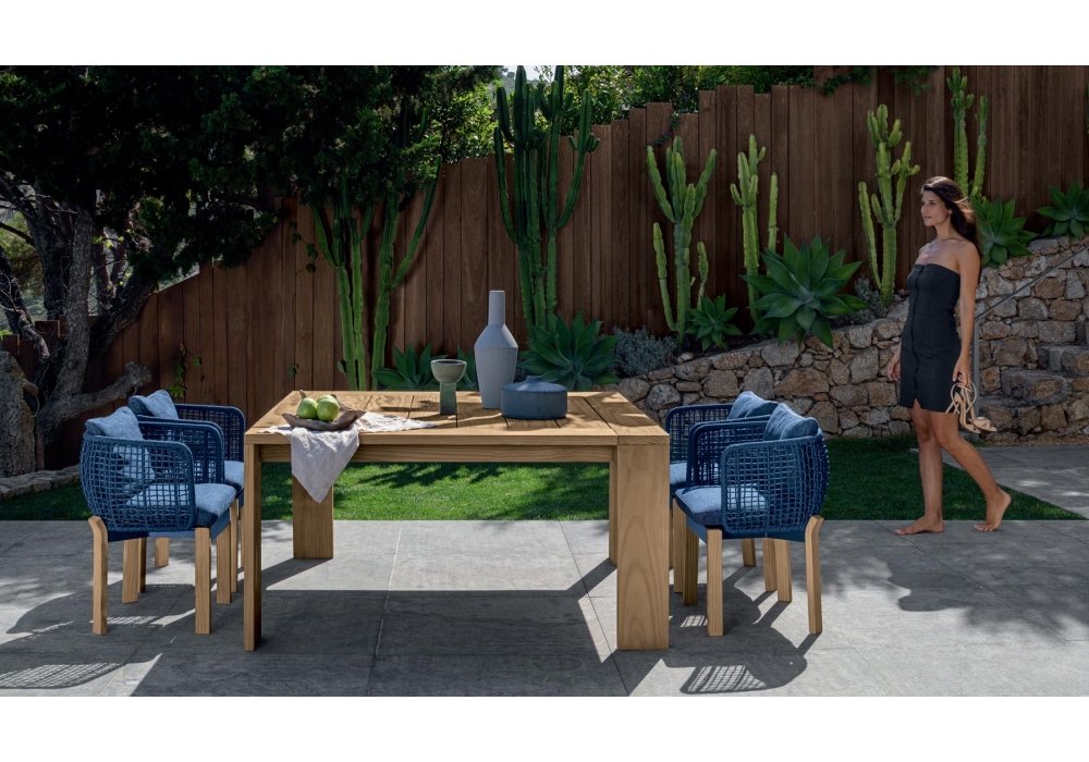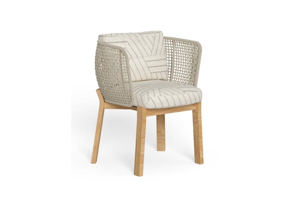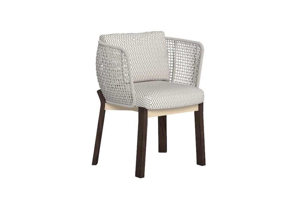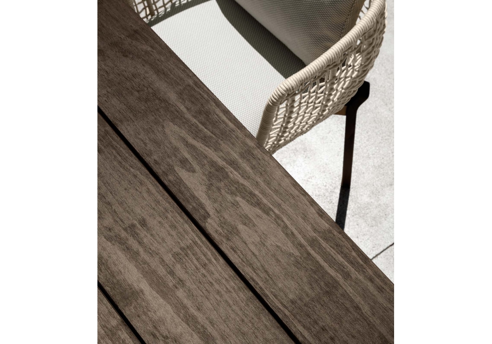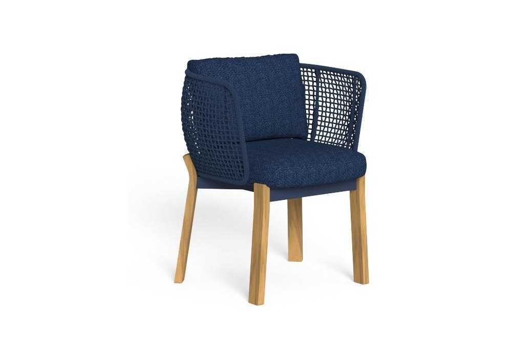 Argo Wood diseñada por Ludovica + Roberto Palomba para Talenti es una silla para exteriores. Está hecho de una estructura tubular de aluminio cubierta con un tejido de cuerdas de tela sintética, pies curvos de madera accoya disponibles en colores palo de rosa o teca natural. Los cojines tienen fundas removibles y están tapizados en telas para exteriores resistentes a la intemperie.