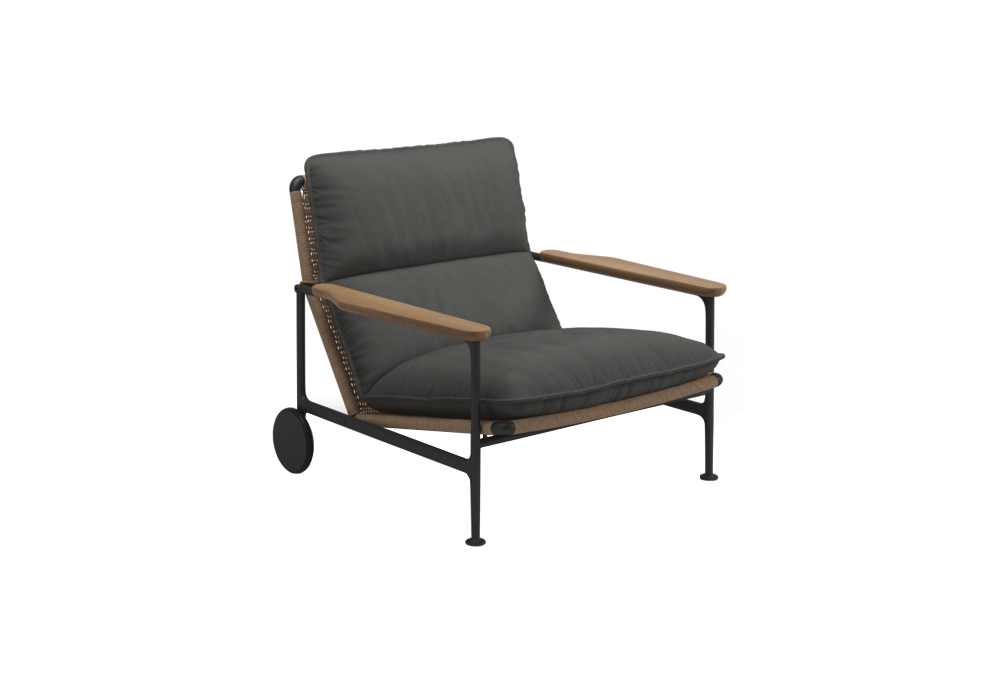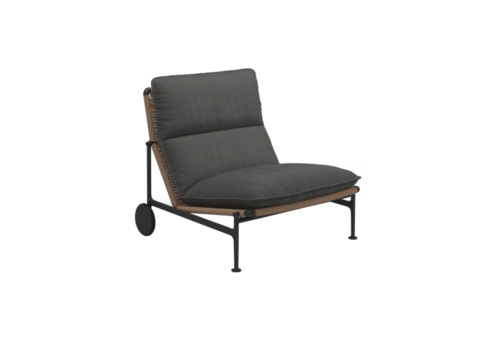 Zenith diseñado por Henrik Pedersen para Gloster es un sillón para exteriores con estructura de aluminio con recubrimiento de polvo, asiento y paneles traseros de mimbre tejido color trigo. Cojín de asiento y respaldo de tela para exteriores incluido.