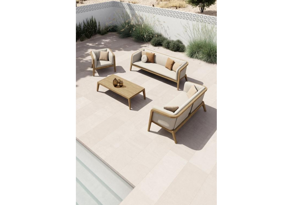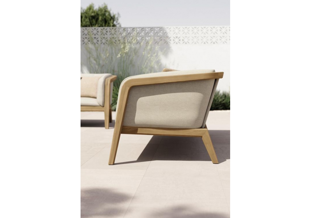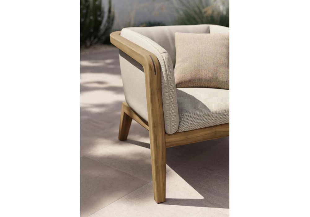 Sunrise diseñada por Matthew Townsend para Manutti es una butaca para exterior con estructura en teca y tapizado en tejido. Disponible en diferentes acabados.