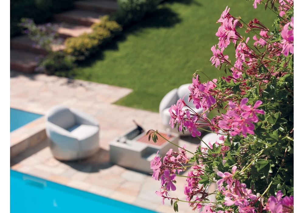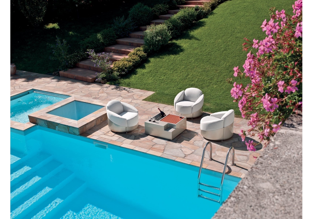 Astrea diseñada por Joe Colombo para Longhi es una butaca de exterior con estructura de fibra de vidrio estratificada manualmente. La estructura exterior está acabada en Gealcoat blanco o negro o en diferentes acabados metalizados. Cojines independientes en espuma de poliuretano multidensidad y Dacron, con fundas completamente desenfundables. Tapicería en tela o piel.