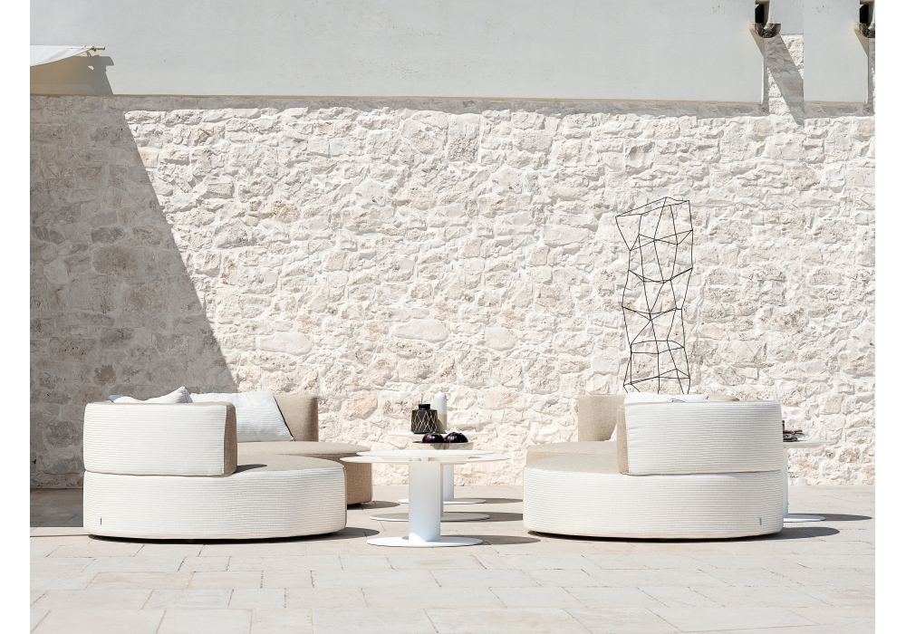 Belt diseñado por Daniele Lo Scalzo Moscheri para Varaschin es un sillón con estructura portante en madera maciza de okumè y acolchado con goma Dryfeel para uso en exteriores. Disponible en dos tamaños y en la versión monotejido o bitejido con diferentes colores.