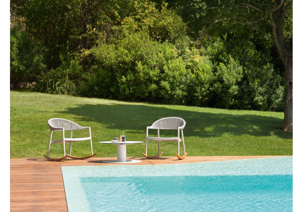 Clever diseñada por R&D para Varaschin es una mecedora con estructura de aluminio pintado en polvo, asiento en tejido técnico, respaldos tejidos en cuerda sintética. Disponible en diferentes acabados. Trineos en madera maciza de Iroko.