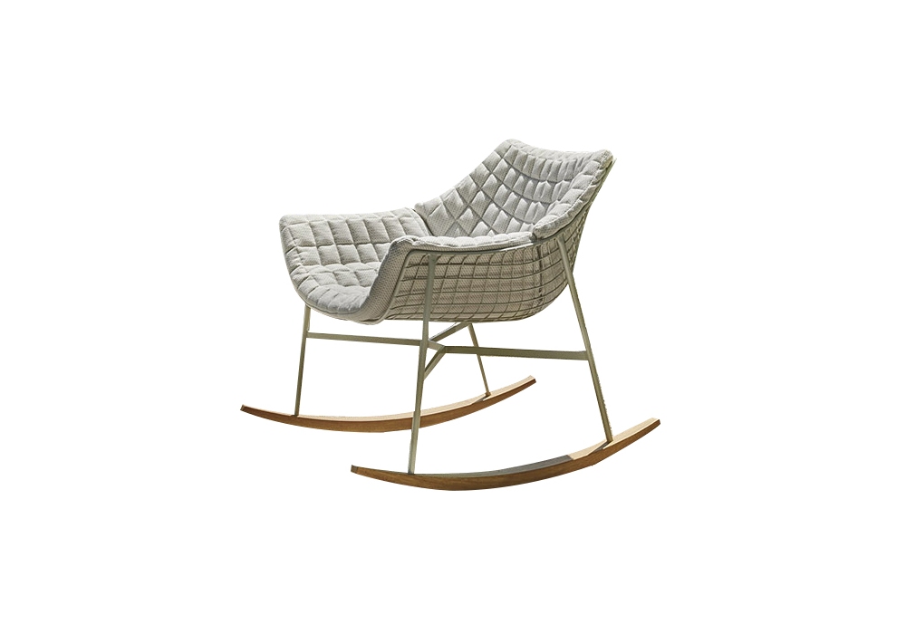 Summer Set diseñado por Cristophe Pillet para Varaschin es un sillón mecedor con estructura en acero pintado en polvo. Disponible en diferentes acabados. Trineos en madera maciza de Iroko.
