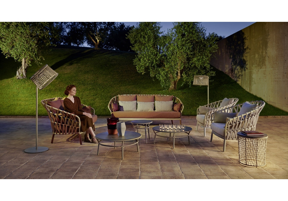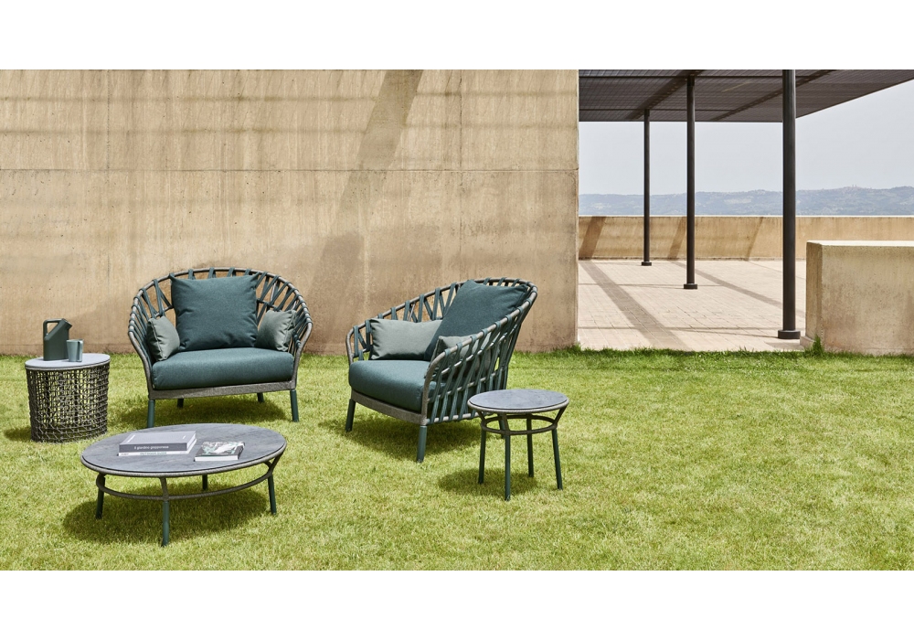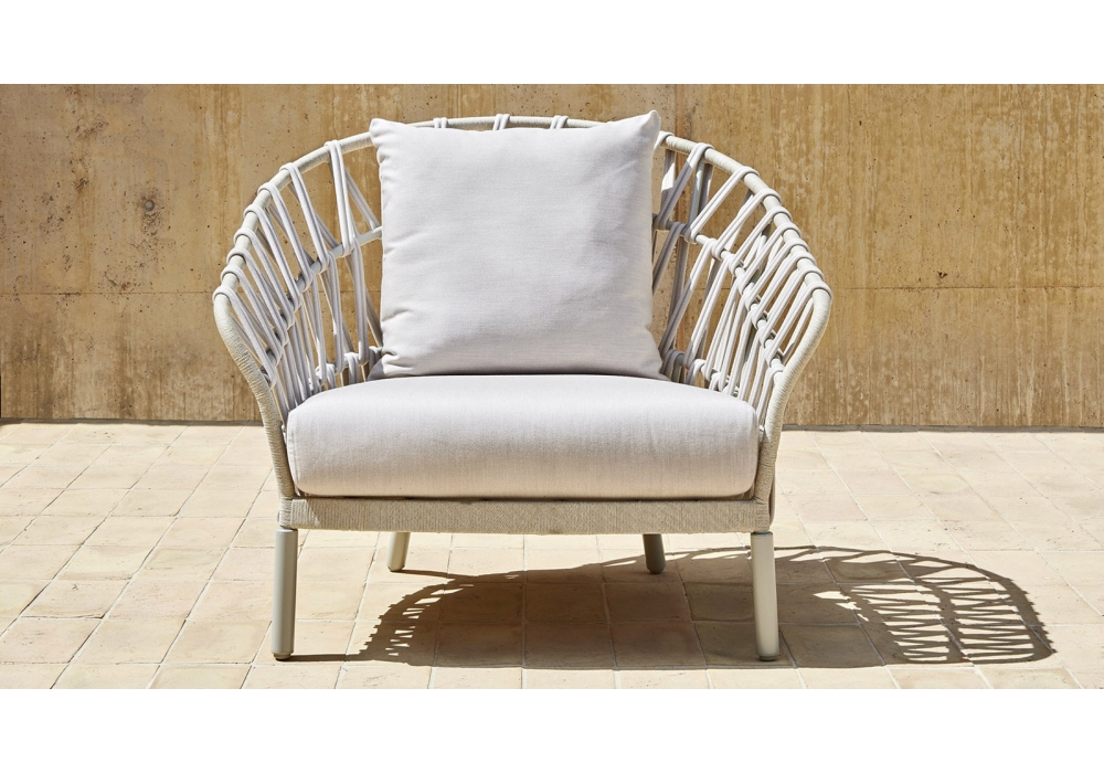 Emma Cross diseñada por Monica Armani para Varaschin es una butaca con base de aluminio pintado en polvo. Estructura de aluminio pintado en polvo entrelazada con banda de tela acrílica. Tapicería de asientos en tela e acolchado con gomas Dryfeel para uso en exteriores. Disponible en diferentes acabados.