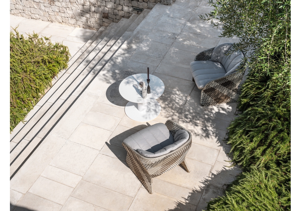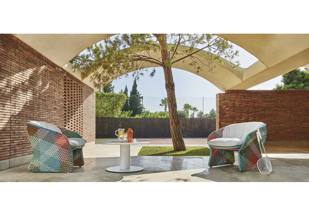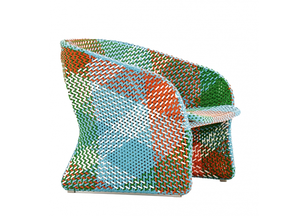 Maat diseñada por Philippe Bestenheider para Varaschin es una butaca tejida a mano en fibra sintética con estructura de aluminio pintado en polvo. Disponible en diferentes acabados.