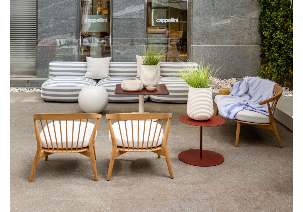 Newood Relax Lido diseñada por Brogliato Traverso para Cappellini es una butaca con estructura de iroko macizo. Cojín de asiento desenfundable con forro interior hidrófugo y funda desenfundable en tejido outdoor.