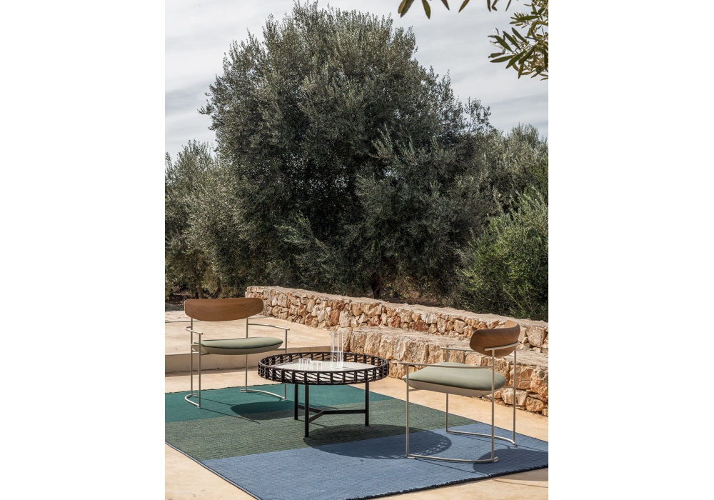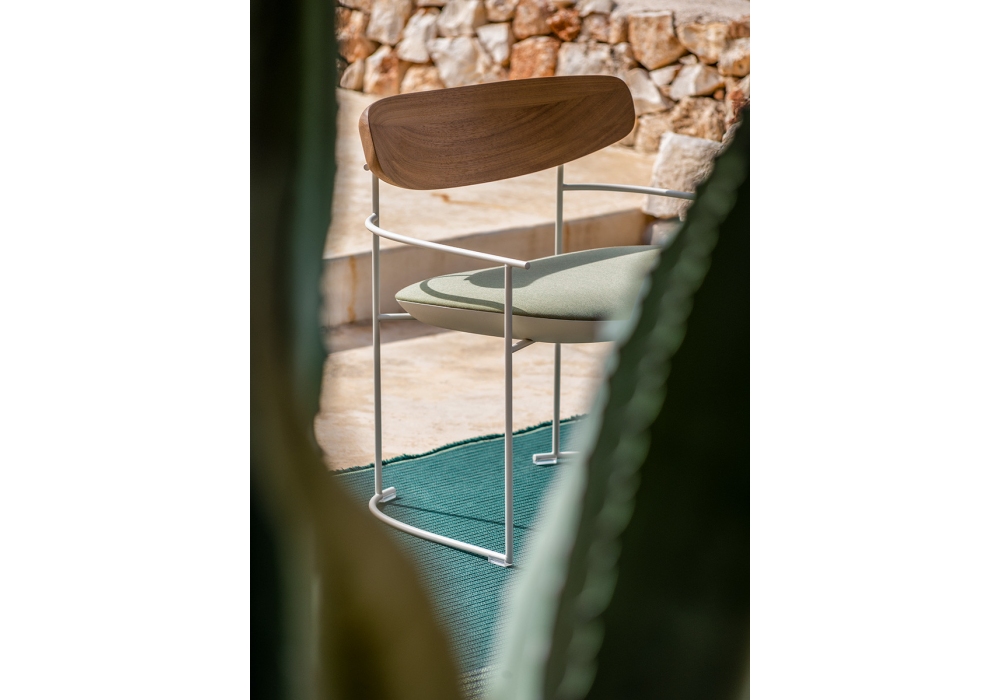 Keel Light Outdoor diseñada por M+V para Potocco es una butaca con estructura en varilla de metal pintado gofrado, respaldo en Iroko macizo y asiento tapizado en espuma de poliuretano ignífuga tapizado en diferentes tejidos con carcasa rígida subyacente pintada en acrílico para exterior, en el mismo color y fino repujado como el cuerpo.