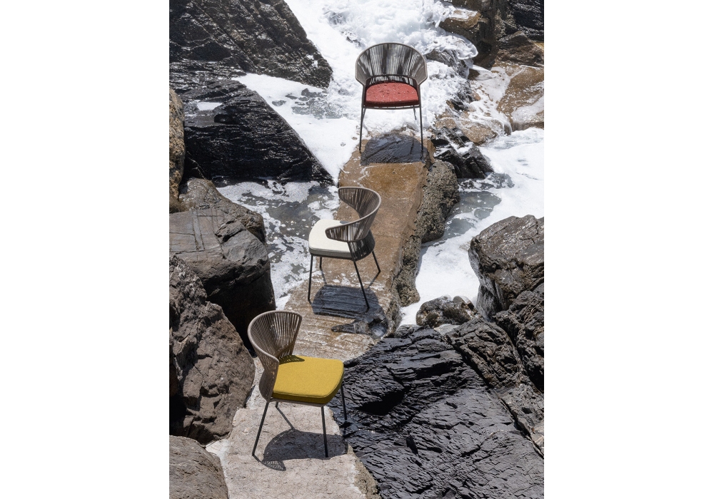 Ola diseñada por Radice Orlandini para Potocco es una silla comedor para exteriores con respaldo en varilla de metal para exteriores tejida a mano y pintada en polvo en cinta "Fly". El cojín del asiento está acolchado con espuma de poliuretano ignífuga y guata de poliéster; el forro de tela es impermeable con costuras selladas; forro final en tejidos de exterior.