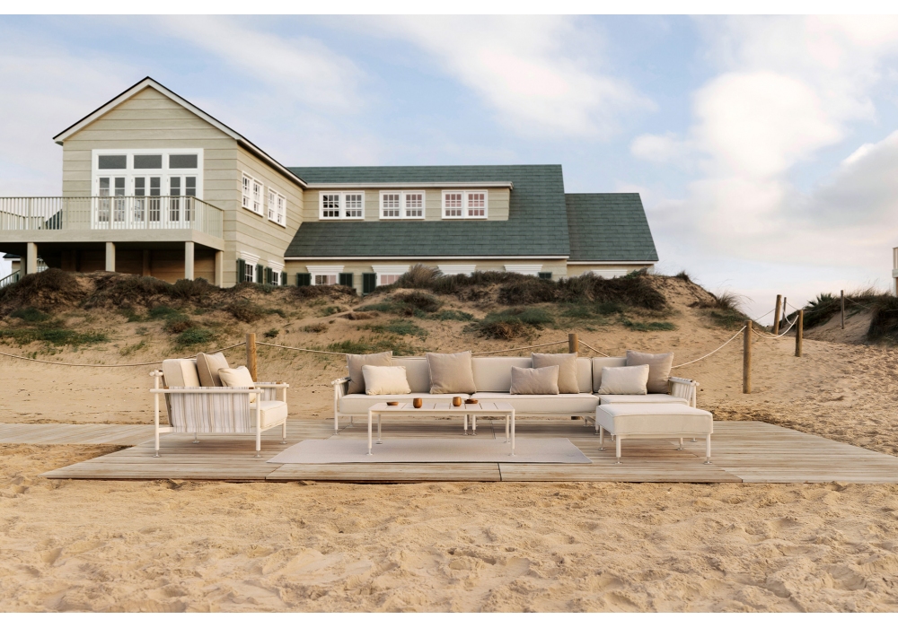 Hamptons diseñada por Ramón Esteve para Vondom es una butaca realizada con estructura de aluminio, detalles en madera de teca y cojines acolchados con revestimiento en tela.