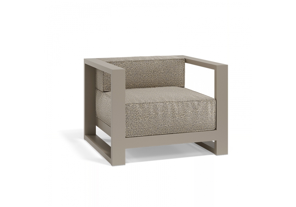 Posidonia diseñada por Ramón Esteve para Vondom es una butaca realizada con estructura de aluminio y cojines acolchados con revestimiento en tela.