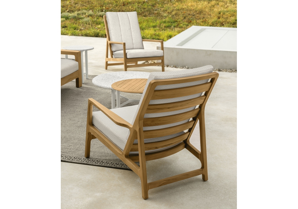 Oliver diseñado por Talenti es un sillón realizado en madera, asiento acolchado y respaldo tapizado en tela.