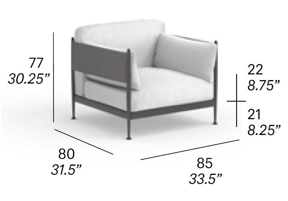 Obi diseñada por Ludovica + Roberto Palomba para Expormim es una butaca realizada en aluminio, cojines acolchados revestidos en tejido. Disponible en diferentes acabados.