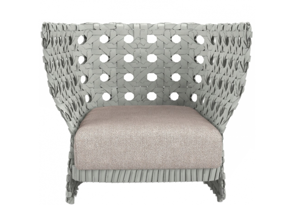 Canasta diseñada por Patricia Urquiola para B&B Italia Outdoor es una butaca de respaldo bajo con estructura de aluminio pintado de blanco y trama de fibra de polietileno de color blanco. Tapicería del asiento en diferentes tejidos.