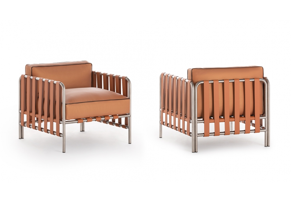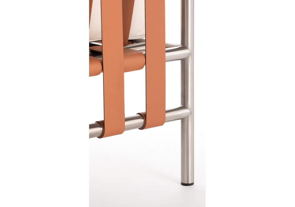 Onsen diseñada por Francesco Meda y David Quincoces para Gandia Blasco es una butaca de diseño con estructura tubular de acero inoxidable soldado manualmente y aluminio con recubrimiento en polvo, y correas de cuero sintético, vinilo y poliéster. Asiento y respaldo de gomaespuma de poliuretano reutilizable y fibras con tejido hidrófugo. Disponible en diferentes acabados.