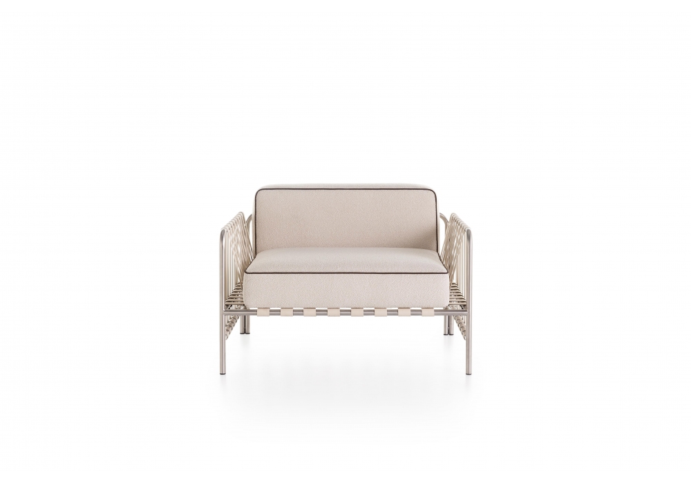 Onsen Sillón diseñado por Francesco Meda y David Quincoces para Gandia Blasco está hecho con estructura tubular de acero inoxidable soldado manualmente y aluminio con recubrimiento en polvo, y correas de cuero sintético, vinilo y poliéster. Asiento y respaldo de gomaespuma de poliuretano reutilizable y fibras con tejido hidrófugo. Disponible en diferentes acabados.