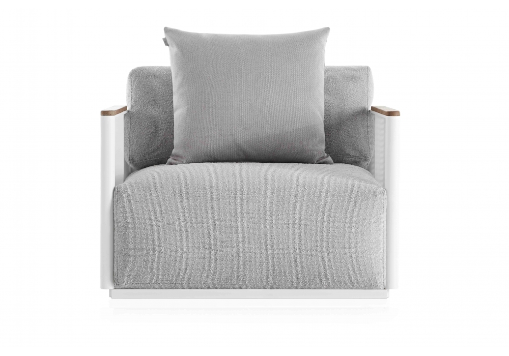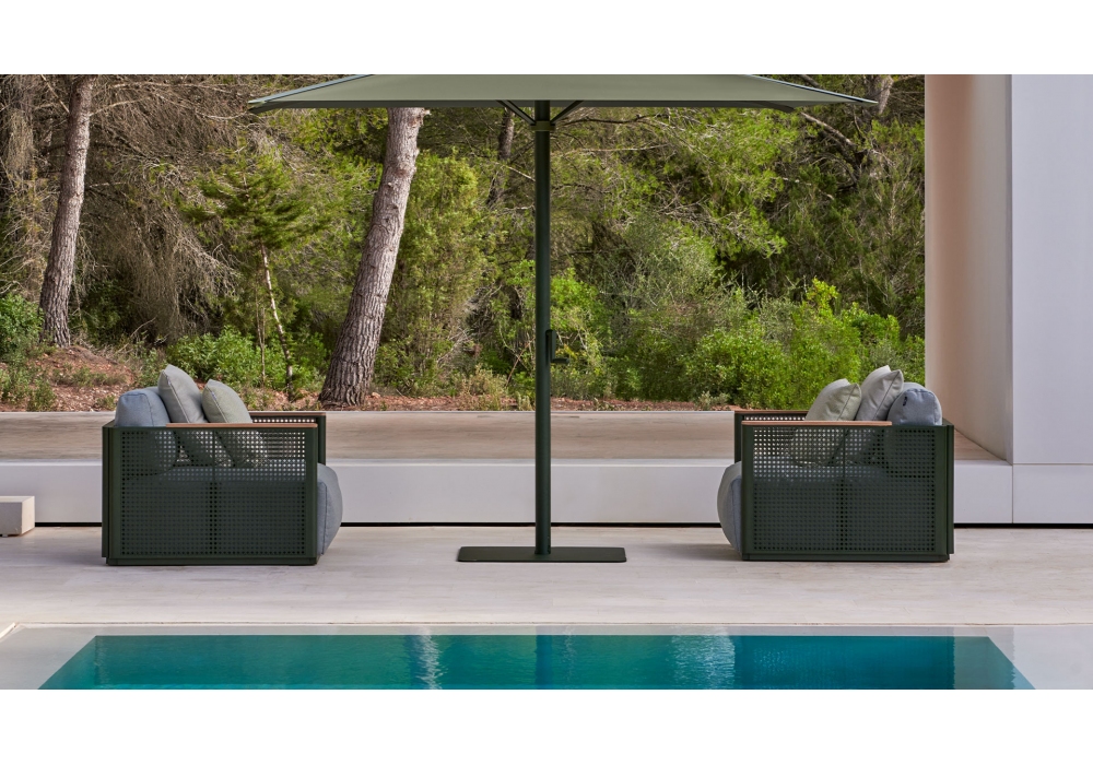 Bosc diseñada por Made Studio para Gandia Blasco es una butaca de diseño fabricada en aluminio soldado con recubrimiento en polvo y chapa microperforada que reproduce patrones de mimbre hechos a mano. Reposabrazos de madera de iroko, asiento, respaldo y cojín de gomaespuma de poliuretano reutilizable con fibra de poliéster hidrófuga. Disponible en diferentes acabados. Cojines incluidos.