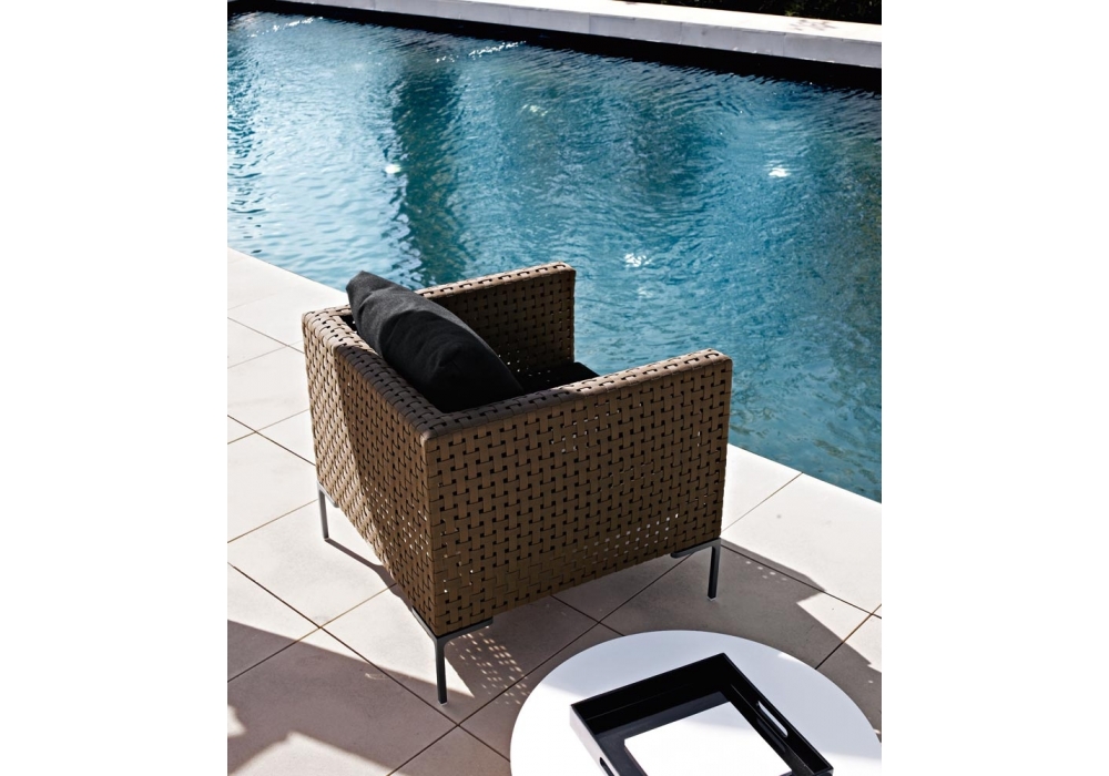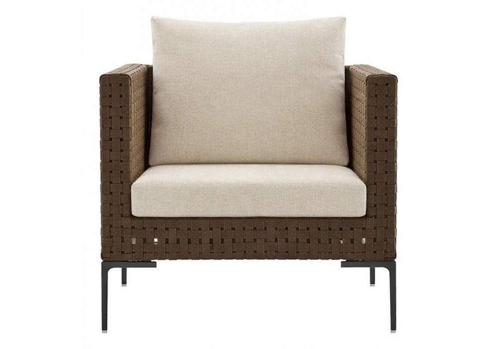 Charles Outdoor diseñado por Antonio Citterio para B&B Italia Outdoor es un sillón con revestimiento de tela, trenzado en polipropileno marrón, patas en aluminio fundido barnizado níquel bronceado. Cojín de asiento en poliuretano perfilado y cojín de respaldo en fibra de poliéster.