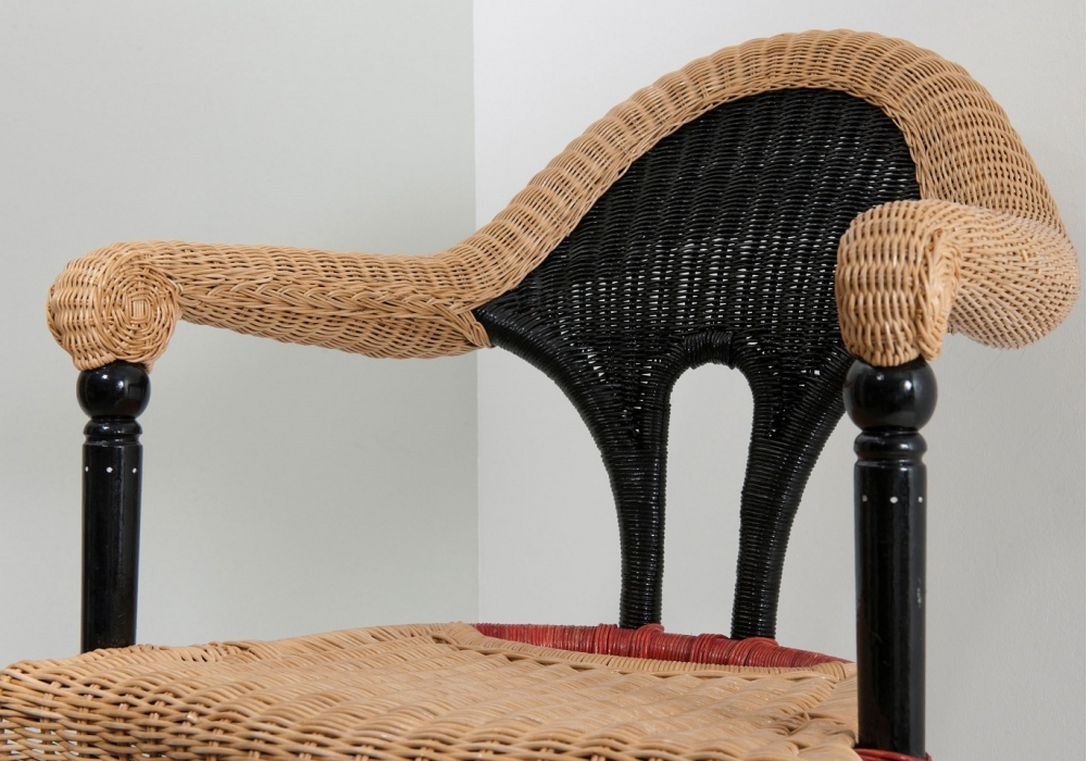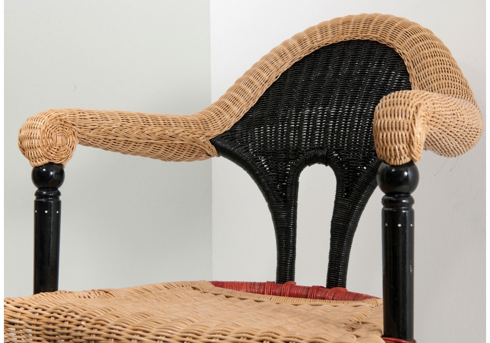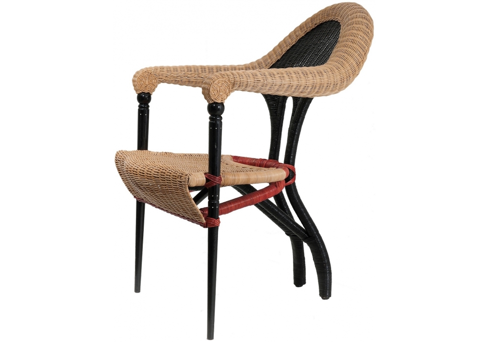 Liba diseñada por Borek Sipek para Driade es una butaca con asiento y respaldo en rattan revestido en mimbre natural, rojo y negro. Patas delanteras en madera maciza ebonizada. Solo para uso interno.