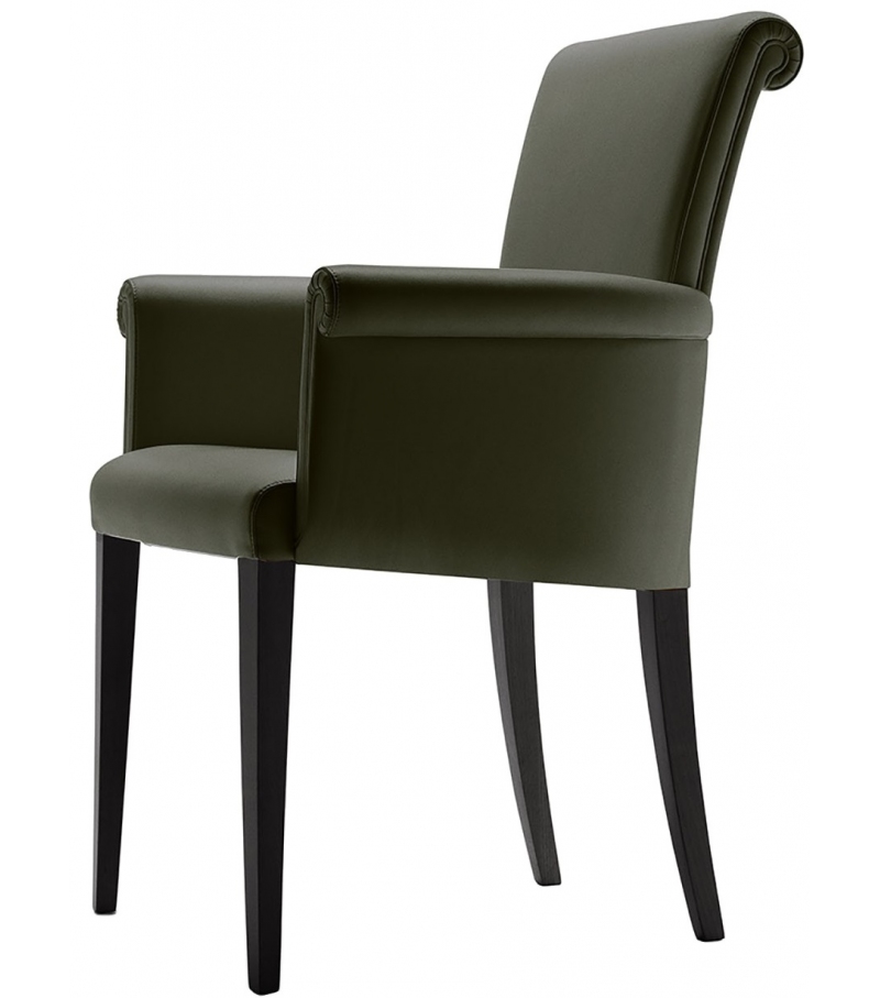 Vittoria diseñado por Poltrona Frau es un silloncito compuesto por estructura portante y patas de madera maciza de haya curtida, relleno de espuma de poliuretano. Las patas están disponibles en los siguientes acabados: fresno teñido wengé y fresno teñido moka. Revestimiento en cuero Pelle Frau® o tejido.