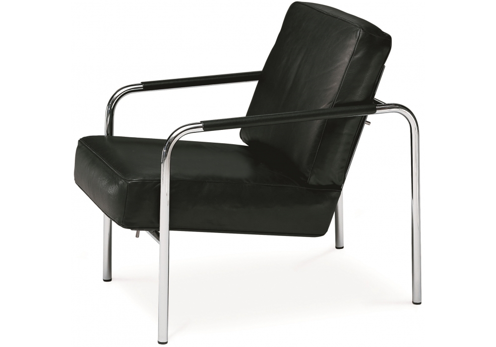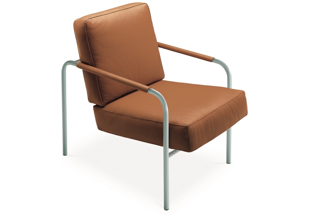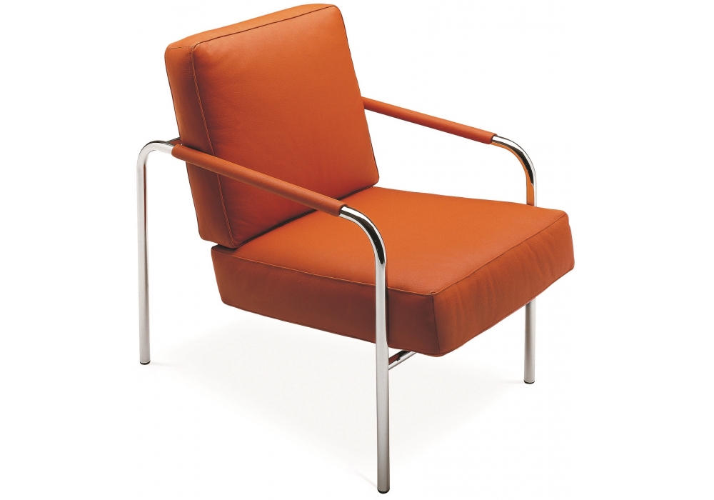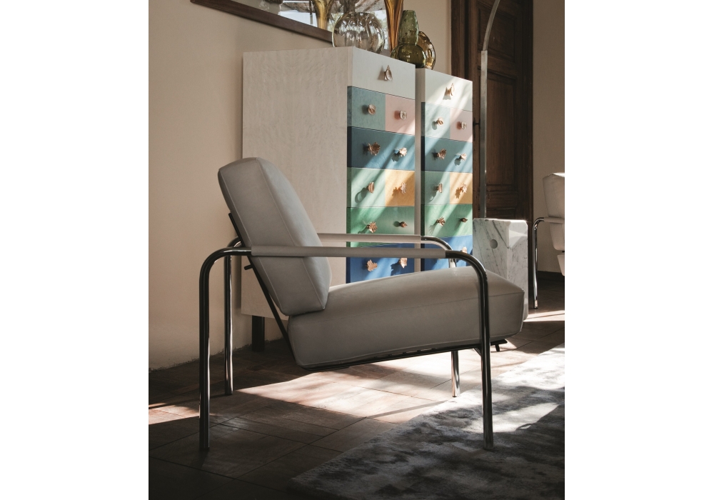 852 Susanna diseñado por Gabriele Mucchi para Zanotta es un sillón con estructura en acero cromado, o color natural o negro satinado niquelado, o barnizado negro. Revestimiento de tela o piel. En la versión de tela, los reposabrazos son de cuero 95.