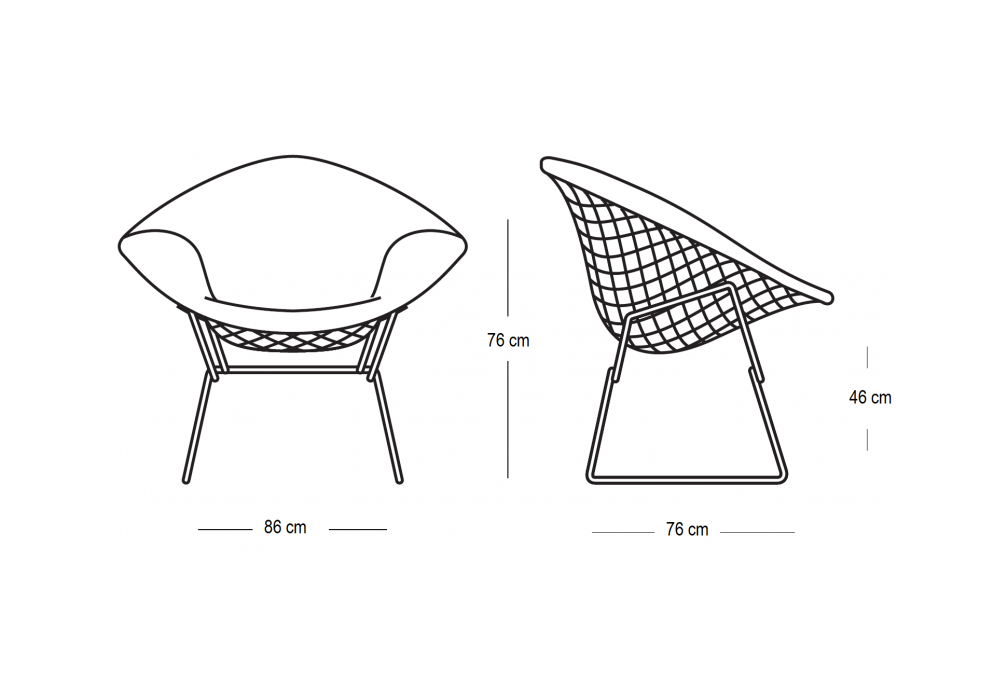 Bertoia Diamond diseñada por Harry Bertoia para Knoll es una butaca tapizada en diferentes tejidos o pieles. Estructura en varilla de acero soldada en cada intersección disponible en diferentes acabados.