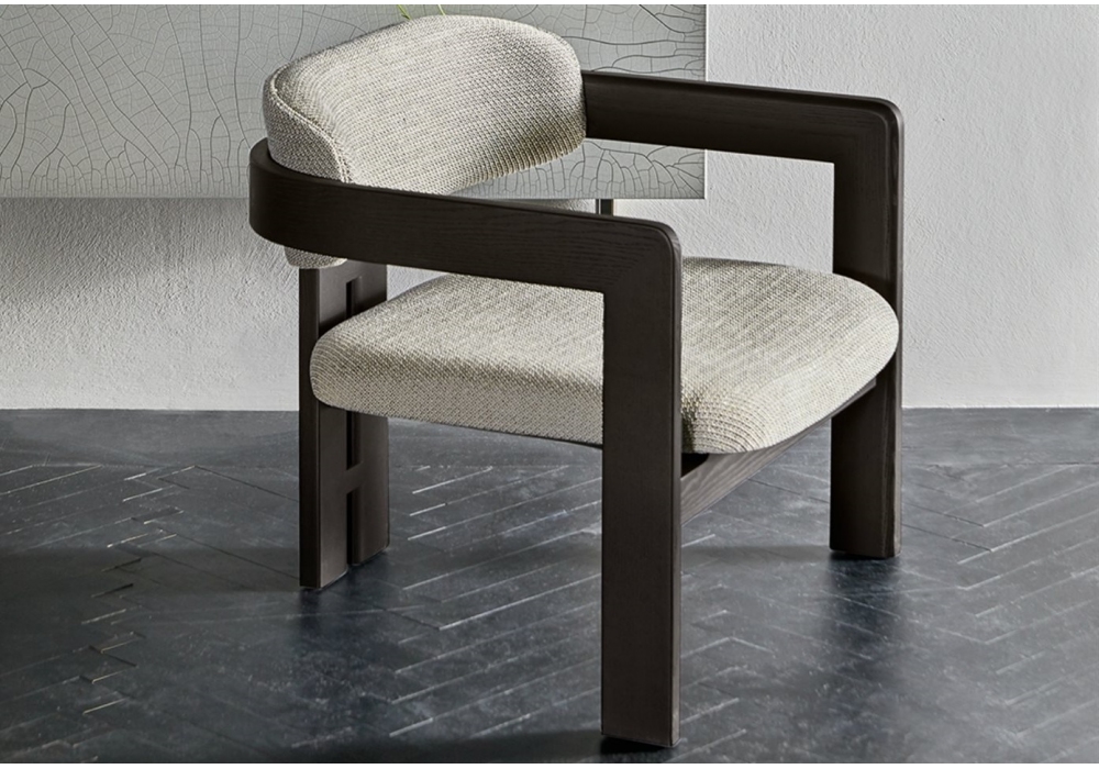 0417 diseñado por Studio G&R para Gallotti&Radice es un sillón con estructura en fresno macizo curvado teñido poro abierto negro. También disponible en fresno natural, teñido tabaco, teñido poro abierto blanco o fresno teñido poro abierto gris humo. Asiento y respaldo de contrachapado curvado con acolchado de espuma de poliuretano revestido de tejido o piel según muestrario. Revestimiento no desenfundable.