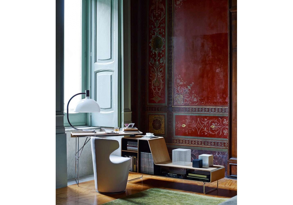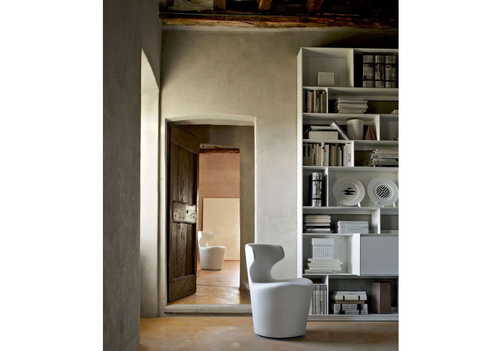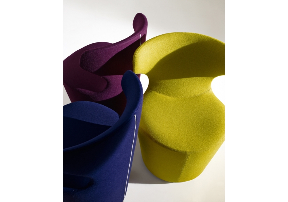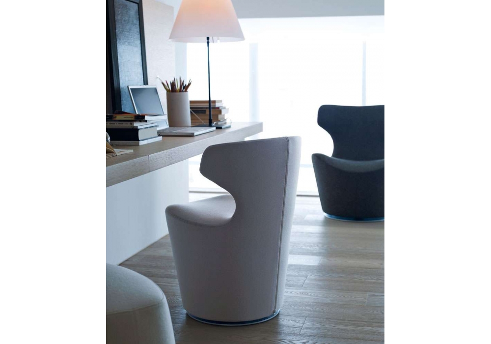 Mini Papilio diseñado por Naoto Fukasawa para B&B Italia es un pequeño sillón con base giratoria, con o sin mecanismo de retorno, en laminado de acero y aluminio extruido. Estructura interna de acero tubular y perfiles de acero con acolchado de espuma de poliuretano flexible en frío Bayfit®, revestimiento de fibra de poliéster. Revestimiento en diferentes tejidos o pieles.