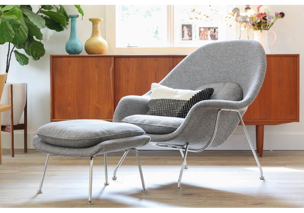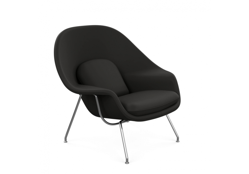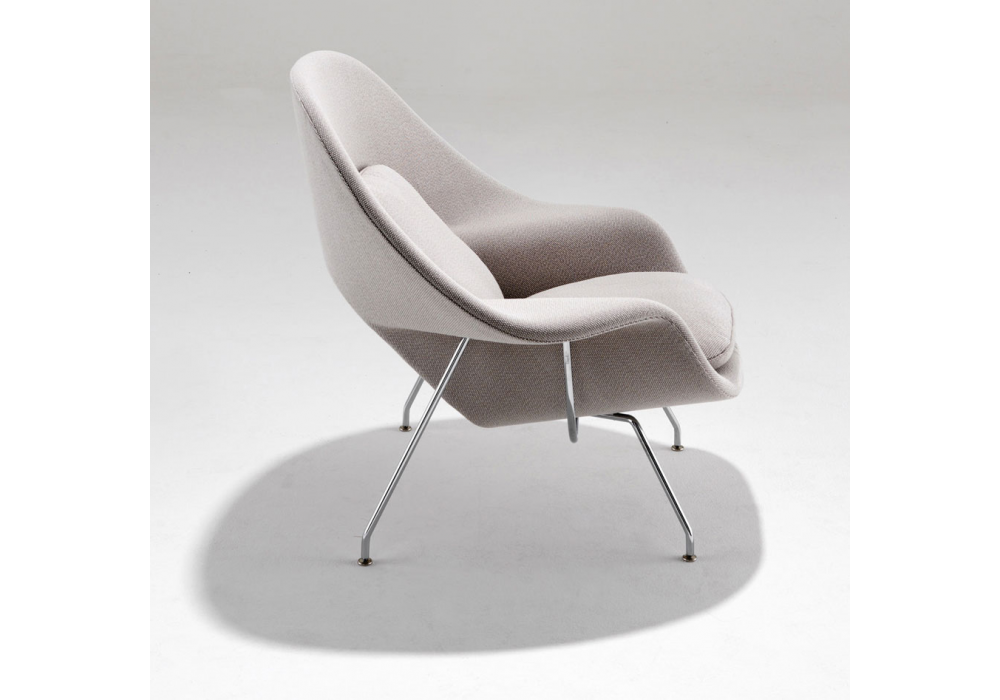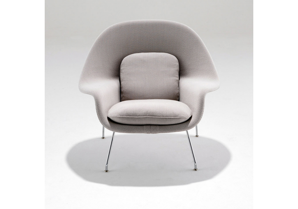 Womb diseñado por Eero Saarinen para Knoll es un sillòn con base de acero cromado o pintado de negro. Carcasa de fibra de vidrio espumada y revestida de tejido en varios acabados. Disponible en versión con o sin puf.