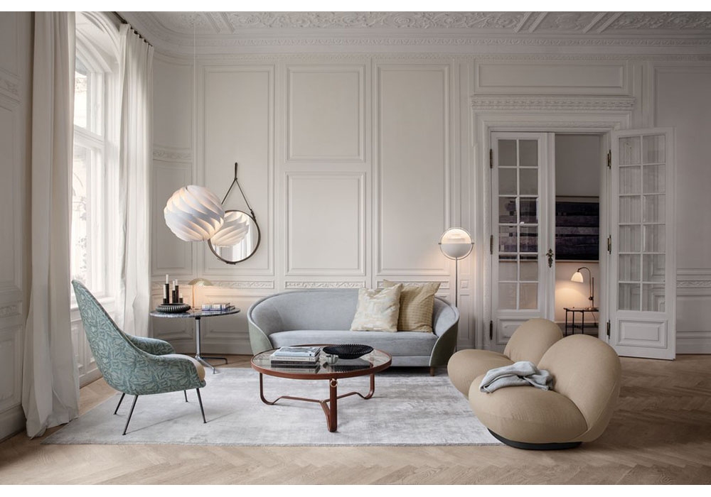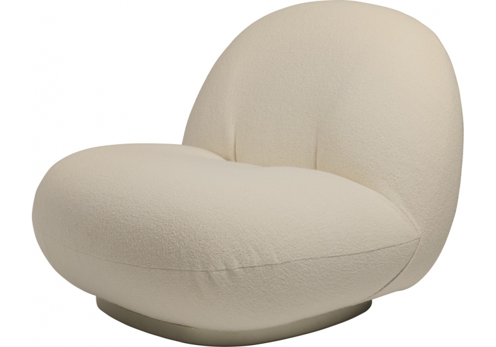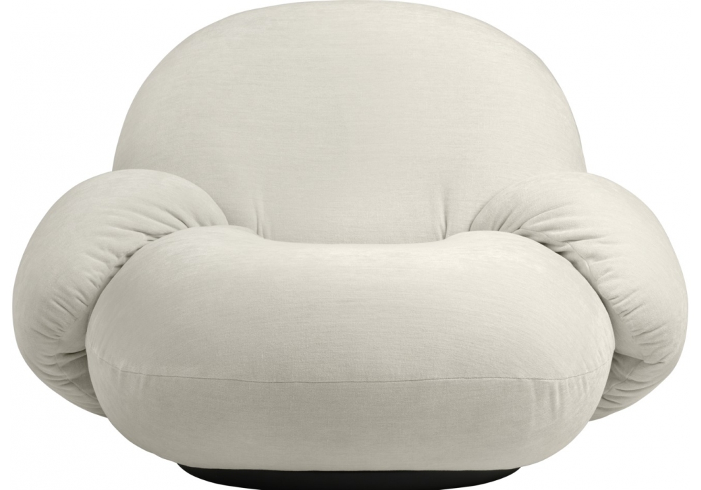 Pacha diseñado por Pierre Paulin para Gubi es un sillón lounge completamente acolchado y tapizado en tela o piel con base de madera. Está disponible con y sin reposabrazos y también en versión giratoria.
