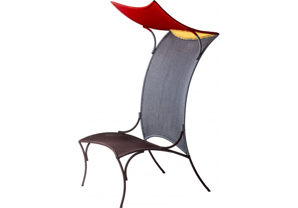 Arco diseñado por Martino Gamper para Moroso es un sillón alto realizado con base de acero pintado e hilos de polietileno tejidos a mano de colores.