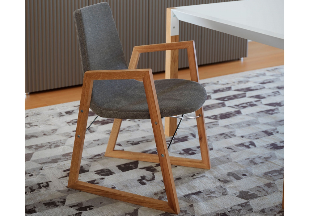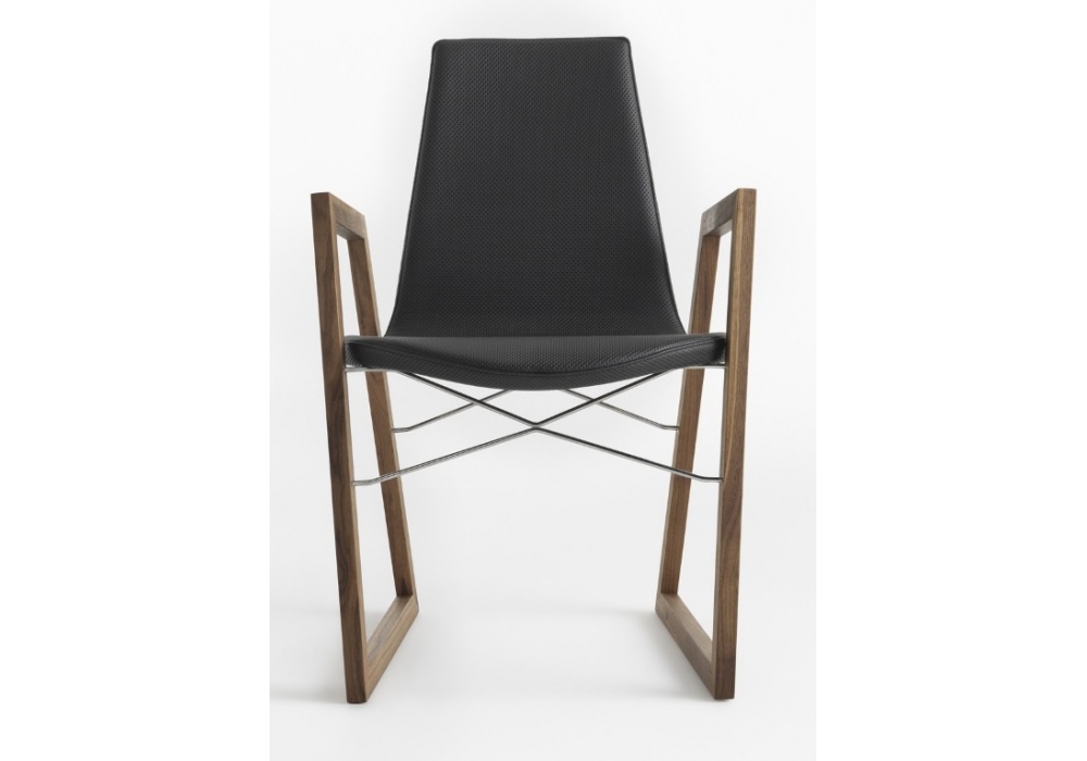 Ray diseñado por Orlandini Design para Casamania & Horm es un sillón realizado con estructura de madera maciza con cruces de acero cromado, asiento y respaldo tapizados en tela, ecopiel o piel.