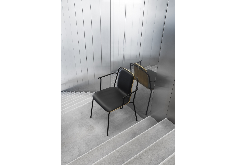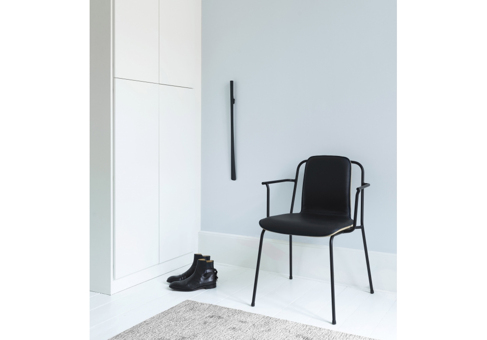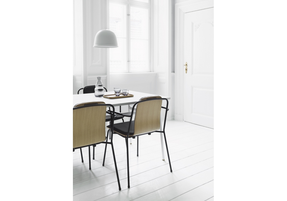 Studio, diseñado por Simon Legald para Normann Copenhagen es un sillón con carcasa de roble tapizado en piel o tela en diferentes acabados. La estructura de soporte es de acero tubular con recubrimiento de polvo negro.