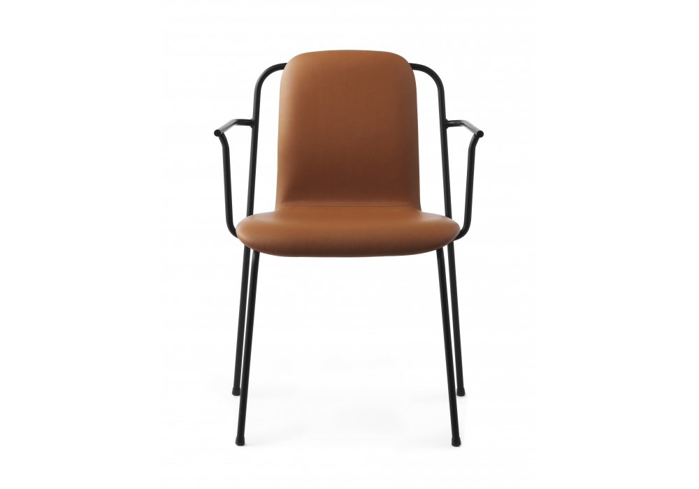 Studio, diseñado por Nicholai Wiig Hansen para Normann Copenhagen es un sillón con carcasa de madera completamente revestida de piel o tejido en diferentes acabados. La estructura portante es de acero tubular pintado con polvos, en un solo color negro.
