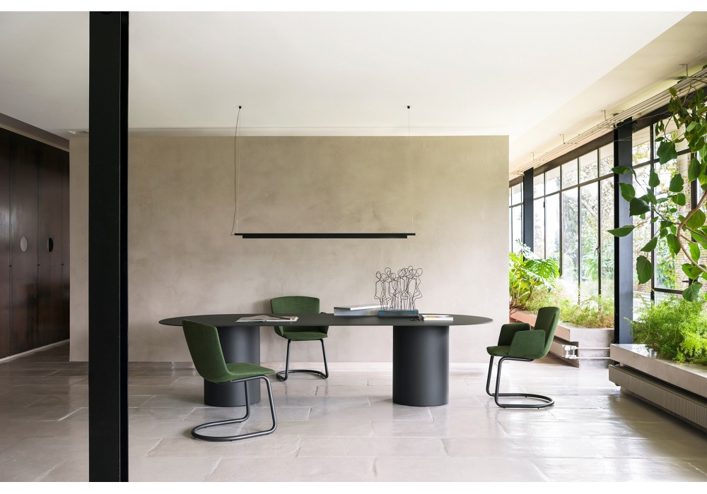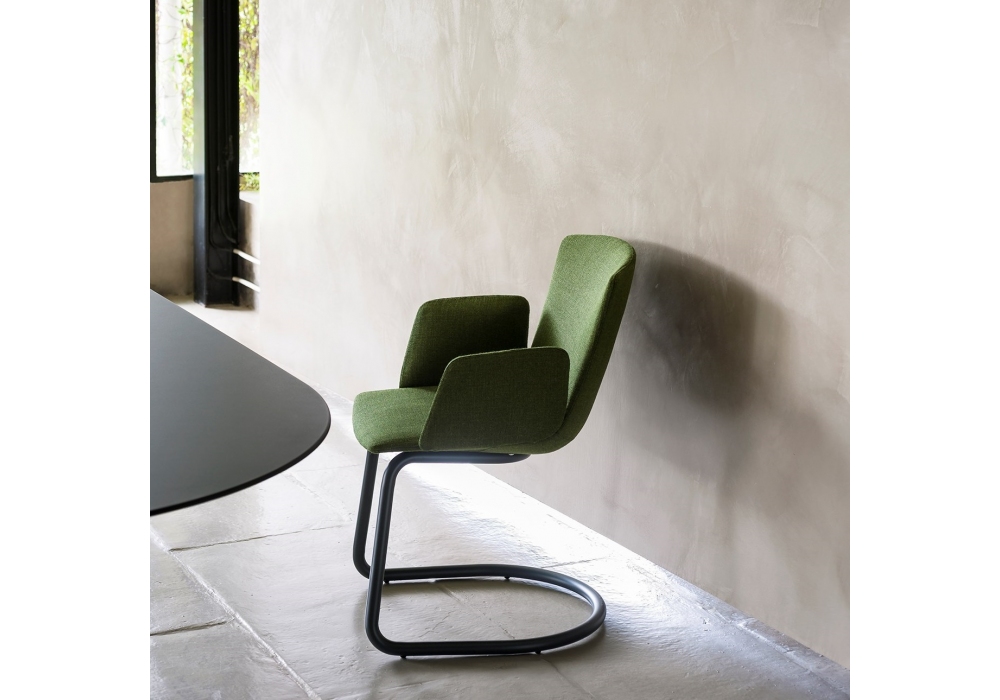 Calum Home Cantilever diseñado por Simon Pengelly para Desalto es un sillón con asiento moldeado en poliuretano rígido y acolchado en espuma. Base en acero tubular curvado ø 30 mm. Disponible sin reposabrazos o con reposabrazos acolchados y tapizados como el asiento.