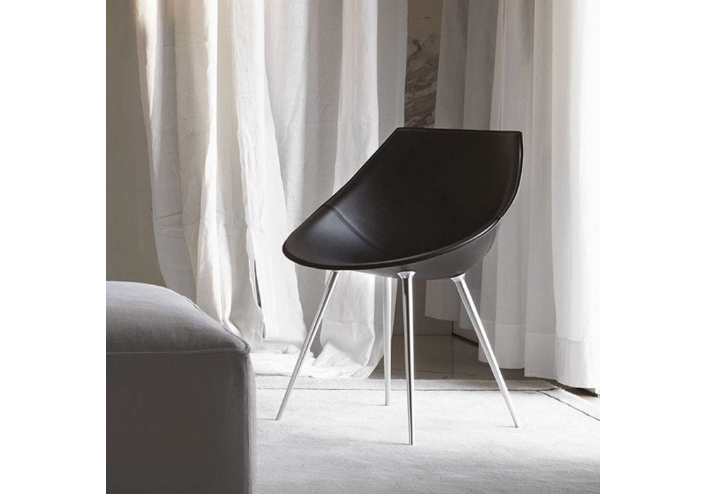 Lagò Cuoio diseñada por Philippe Starck para Driade es una butaca con patas en aluminio anodizado y carcasa de poliuretano rígido completamente revestida en piel en los colores gris tórtola, marrón, blanco o negro. Solo para uso interno.