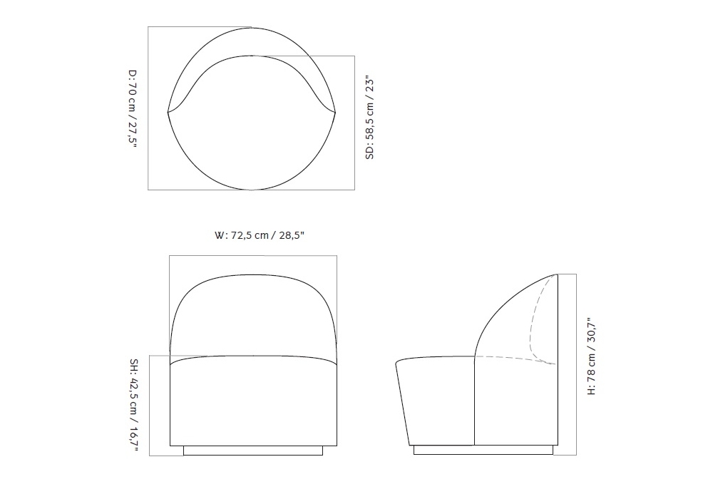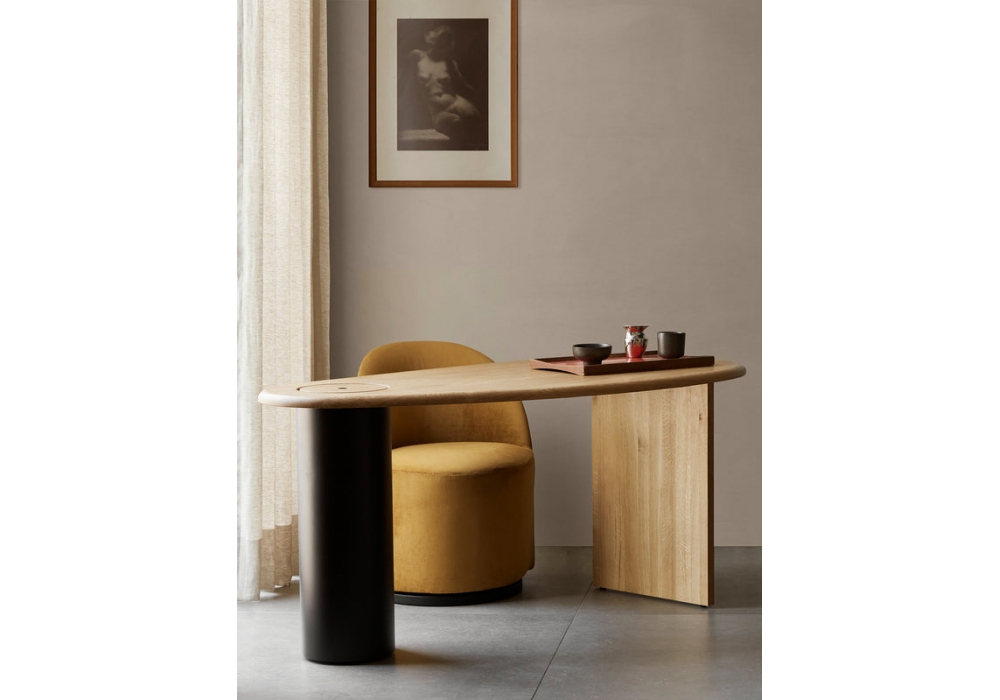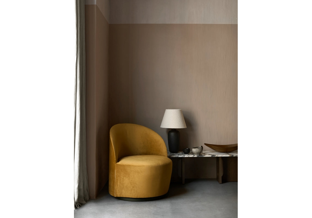 Tearoom Side diseñado por Nick Ross para Audo Copenhagen es un sillón giratorio, acolchado y tapizado en tejido, base en MDF negro. Disponible en diferentes acabados y medidas.