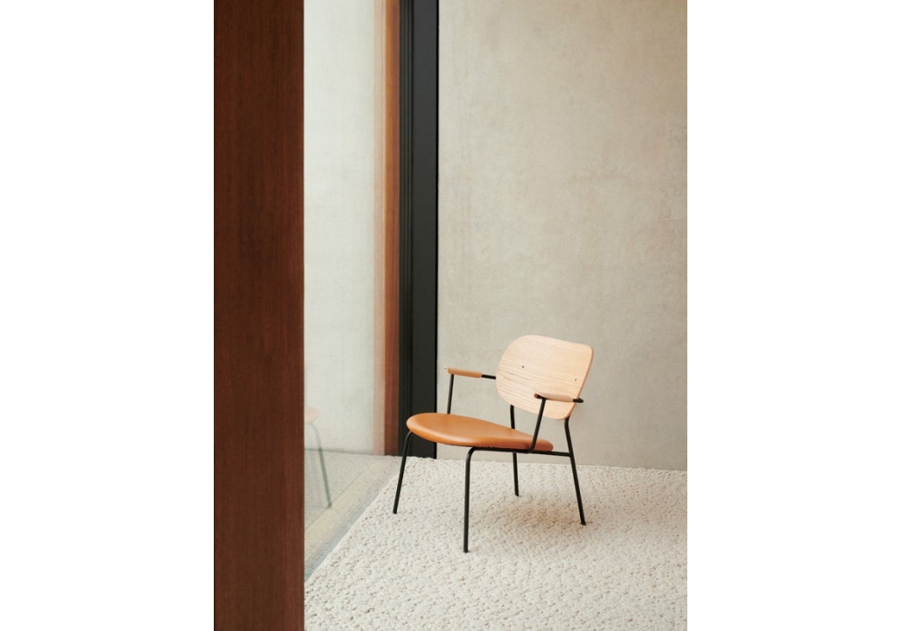 Co Seat diseñada por Norm Architects & Els Van Hoorebeeck para Audo Copenhagen es una butaca con asiento acolchado tapizado en tejido o piel, respaldo en roble y patas en acero pintado en polvo negro. Disponible en diferentes acabados.