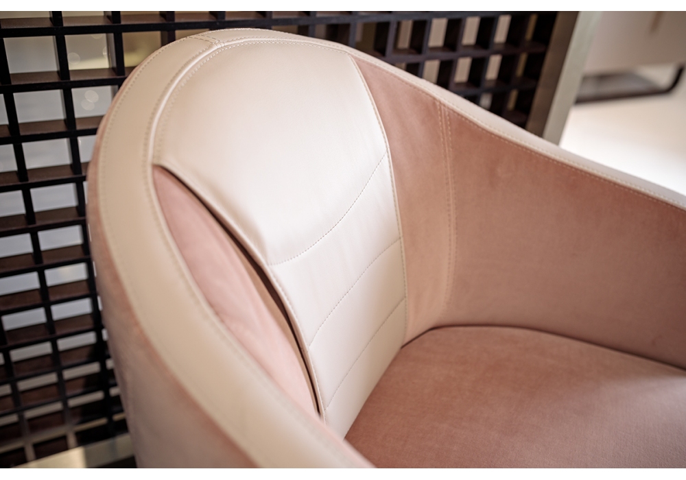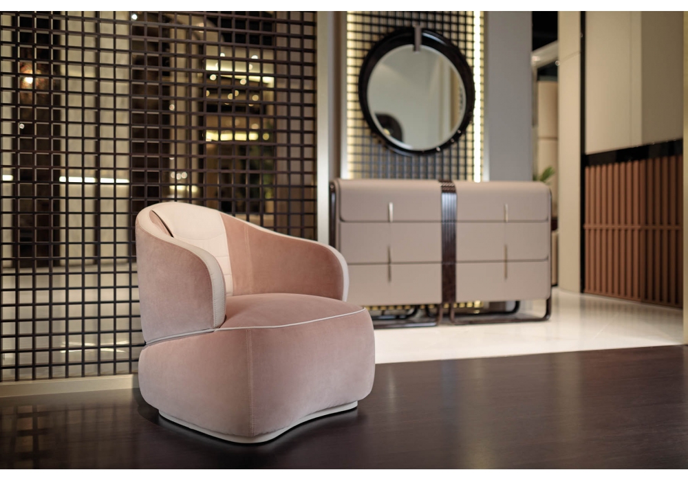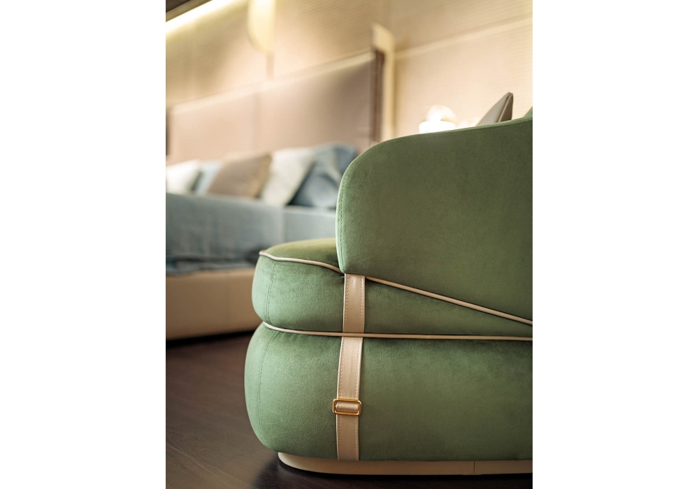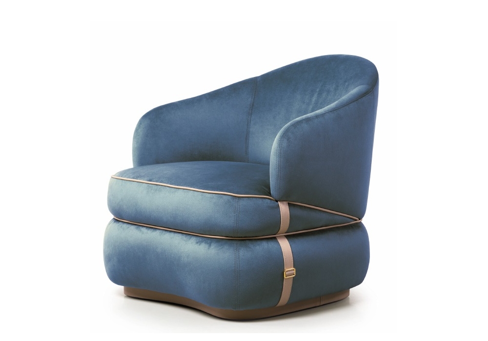 Bloom diseñada y producida por Turri es una sillón con estructura de madera maciza multiestrato acolchada con espuma de poliuretano multidensidad con revestimiento en diferentes tejidos o pieles no desenfundables. Detalles metálicos en acabado dorado claro. Base revestida en piel. Disponible en la versión con reposacabezas o con cinturón.